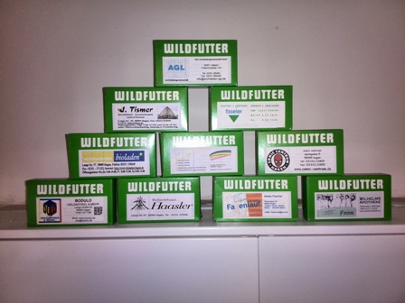Das Futter für die Wildtiere wird in wiederverwendbare Schachteln eingefüllt. Die Wild- und Freigehegefutter-Pellets (Ergänzungsfutter für Tiere in freier Wildbahn und Freigehegen) setzen sich aus folgenden Komponenten zusammen: Luzerngrünmehl, Haferschälkleie, Weizenkleie, Maiskleberfutter, Melasseschnitzel, Rapsschrot, Melasse und Soja-Pflanzenöl. Die natürliche Nahrungsaufnahme wird durch das Futter ergänzt und nicht ersetzt.